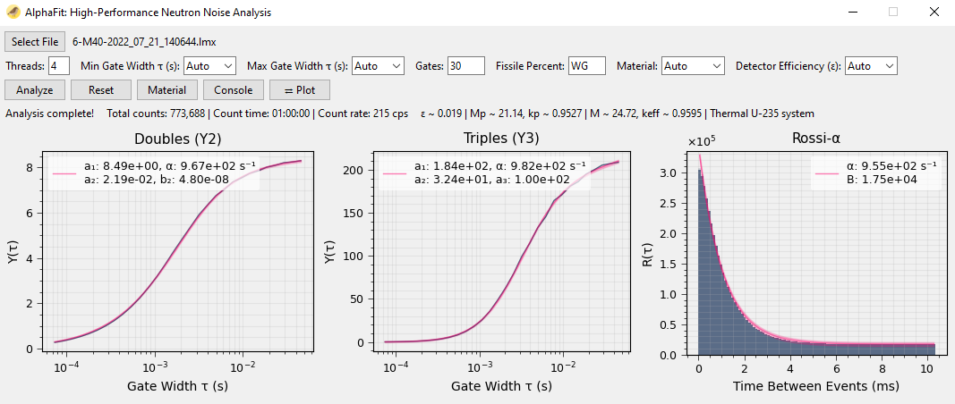 The production version of AlphaFit is out. It's compiled in C and includes Rossi-α fits, uncertainty analysis, LaTeX documentation, and a couple Easter eggs. It can also run streaming neutron and gamma ray data, which means no more guess-and-check to figure out how long a measurement needs to run before it converges.