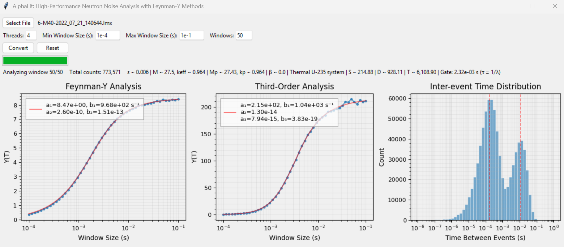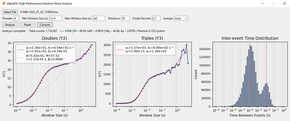 AlphaFit (v60) is out. I implemented and then dropped lag-1 autocovariance and a few other methods because they weren't bringing universal solutions to the table. AlphaFit uses a simple Y3/Y2 ratio to assess multiplication, combined with novel 2-step Hage-Cifarelli and spectral methods to cross-validate multiplication and assess Beff, detector efficiency, and neutron lifetime(s).